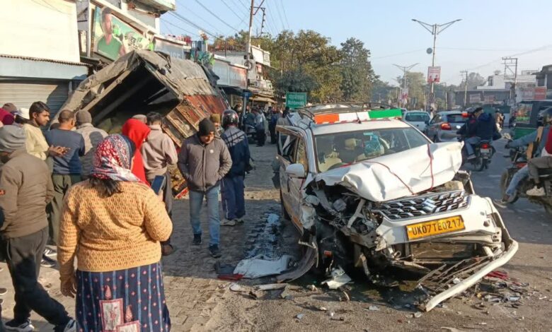 दून में ट्रक ने कई गाड़ियों को मारी टक्कर, दुकानों में घुसकर पलटा