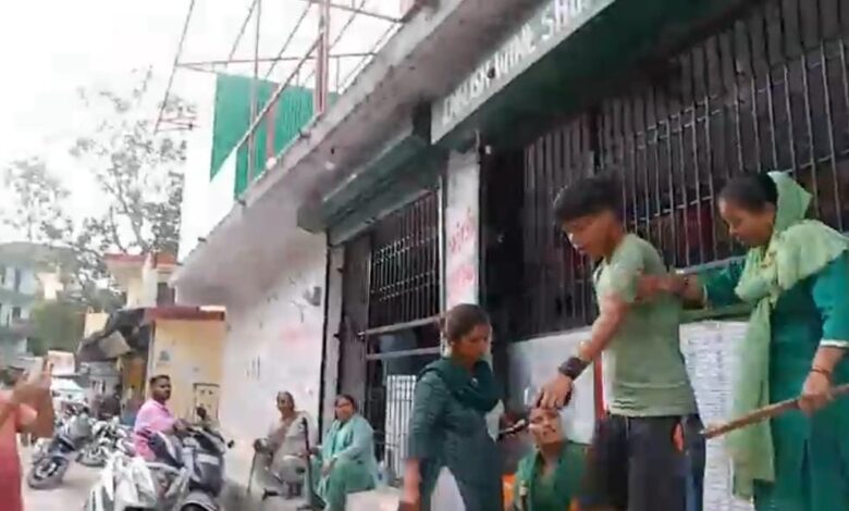 शराब विरोधी प्रदर्शन के दौरान ठेके पर शराब लेने वालों को महिलाओं ने डंडों से दौड़ाया