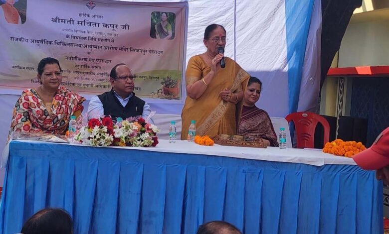 देहरादून। विधायक कैंट सविता कपूर ने बृहस्पतिवार को आयुष्मान आरोग्य मंदिर (आयुष), राजकीय आयुर्वेदिक चिकित्सालय, निरंजनपुर के सौंदर्यकृत भवन का उद्घाटन किया गया। इस अवसर पर विधायक ने कहा कि सरकार आमजन को बेहतर स्वास्थ्य सुविधाएँ उपलब्ध कराने के लिए निरंतर प्रयासरत है। इस मौके पर जिला आयुर्वेदिक एवं यूनानी अधिकारी ने विधायक को पंचायत भवन में संचालित चिकित्सालय भवन को आयुष विभाग को हस्तांतरित करने का प्रस्ताव भी रखा। इस पर विधायक ने पूर्ण आश्वासन दिया गया।