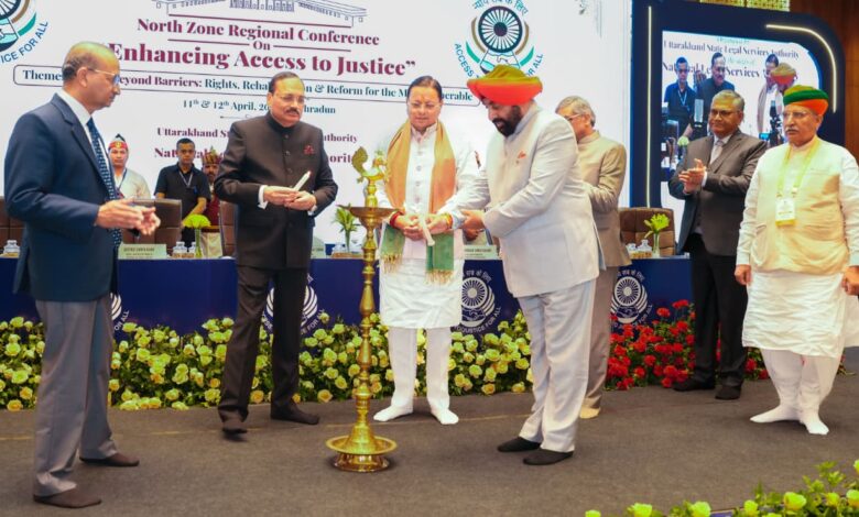 देहरादून। राष्ट्रीय विधिक सेवा प्राधिकरण (नालसा), नई दिल्ली के तत्वाधान में उत्तराखण्ड राज्य विधिक सेवा प्राधिकरण, नैनीताल द्वारा देहरादून में आयोजित दो दिवसीय नॉर्थ ज़ोन रीजनल कॉन्फ्रेंस का आज दिनांक 12 अप्रैल को भव्य समापन हुआ। इस सम्मेलन के समापन के अवसर पर  राज्यपाल लेफ्टिनेंट जनरल गुरमीत सिंह (से नि), भारत के मुख्य न्यायाधीश एवं नालसा के संरक्षक-प्रधान न्यायमूर्ति सूर्यकांत, मुख्यमंत्री पुष्कर सिंह धामी, केन्द्रीय विधि एवं न्याय राज्य मंत्री (स्वतंत्र प्रभार) अर्जुन राम मेघवाल सहित उच्चतम न्यायालय एवं उत्तराखण्ड उच्च न्यायालय के न्यायमूर्तिगण, उत्तर भारत के विभिन्न उच्च न्यायालयों से पधारे माननीय न्यायमूर्तिगण और विधि विशेषज्ञों ने प्रतिभाग किया।
