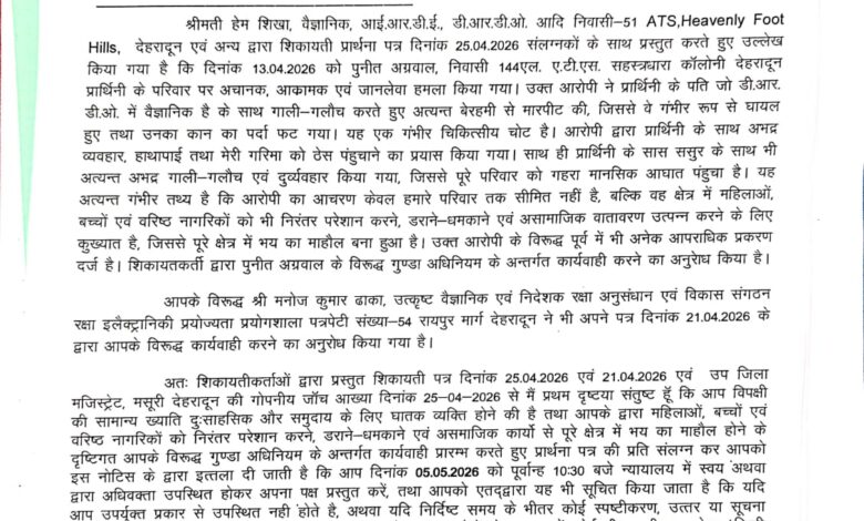 देहरादून। शहर के सहस्त्रधारा रोड स्थित एटीएस कालोनी में बिल्डर की गूंडागर्दी पर जिला मजिस्ट्रेट कोर्ट ने संज्ञान लेते हुए गुंडा एक्ट में नोटिस जारी करते हुए 07 दिन के भीतर प्रतिउत्तर प्रस्तुत करने के निर्देश दिए हैं प्रतिउत्तर प्राप्त न होने के की दशा में जिला बदर की कार्यवाही शुरू कर दी जाएगी। इससे पूर्व भी विवादित बिल्डर पर दीपावली में नाबालिग बच्चों पर पिस्टल लहराने तथा लाईसेंसी शस्त्र को प्रदर्शित करने पर डीएम ने शस्त्र लाईसेंसधारक पुनीत अग्रवाल की लापरवाही मानते हुए उनका शस्त्र जब्त करते हुए शस्त्र लाईसेंस निलम्बित कर दिया था। आरोपी बिल्डर पर डीआरडीओं वैज्ञानिक के साथ मारपीट एवं उत्पीड़न, नशे में धुत होकर एटीएस आरडब्ल्यूए अध्यक्ष के साथ मारपीट, बच्चों से गाली गलौच, दीपावली पर पिस्टल तानने, बच्चों से गाली गलौच एवं गाड़ी से टक्कर मारने का प्रयास, जनरल बाडी मीटिंग में धमकाने अभद्र भाषा का प्रयोग, आरोपी द्वारा निवासियों एवं आरडब्ल्यूए के सदस्यों को जानबूझकर झूठे मुकदमों एवं निराधार आरोपों में फंसाकर उत्पीड़न करने का प्रयास, विधवा महिला की भूमि को कूट रचित रजिस्ट्री एवं अनाधिकृत कब्जा मामलों विभिन्न धाराओं में 05 एफआईआर दर्ज हैं।