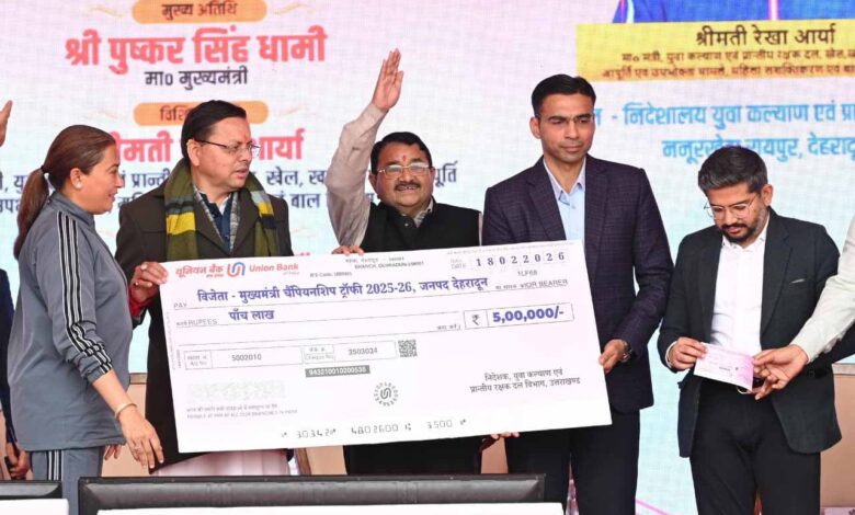 देहरादून। मुख्यमंत्री पुष्कर सिंह धामी ने बुधवार को ननूरखेड़ा, देहरादून में मुख्यमंत्री चैम्पियनशिप ट्रॉफी 2025-26 के समापन समारोह में प्रतिभाग किया। इस अवसर पर मुख्यमंत्री ने देहरादून जनपद को विजेता ट्रॉफी एवं 05 लाख रुपये का चेक प्रदान किया।