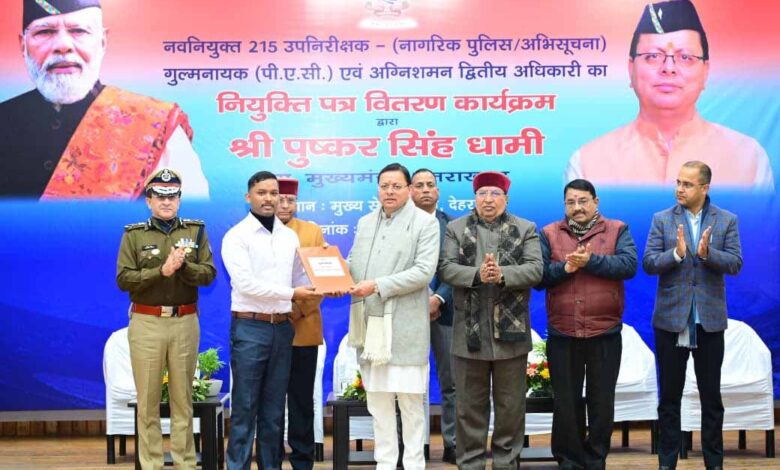 देहरादून। मुख्यमंत्री पुष्कर सिंह धामी ने बुधवार को मुख्यमंत्री कैम्प कार्यालय स्थित मुख्य सेवक सदन में 215 उपनिरीक्षकों को नियुक्ति पत्र प्रदान किये। जिसमें 104 उप-निरीक्षक, 88 गुल्म नायक (पी.ए.सी) एवं 23 अग्निशमन द्वितीय अधिकारी शामिल हैं।